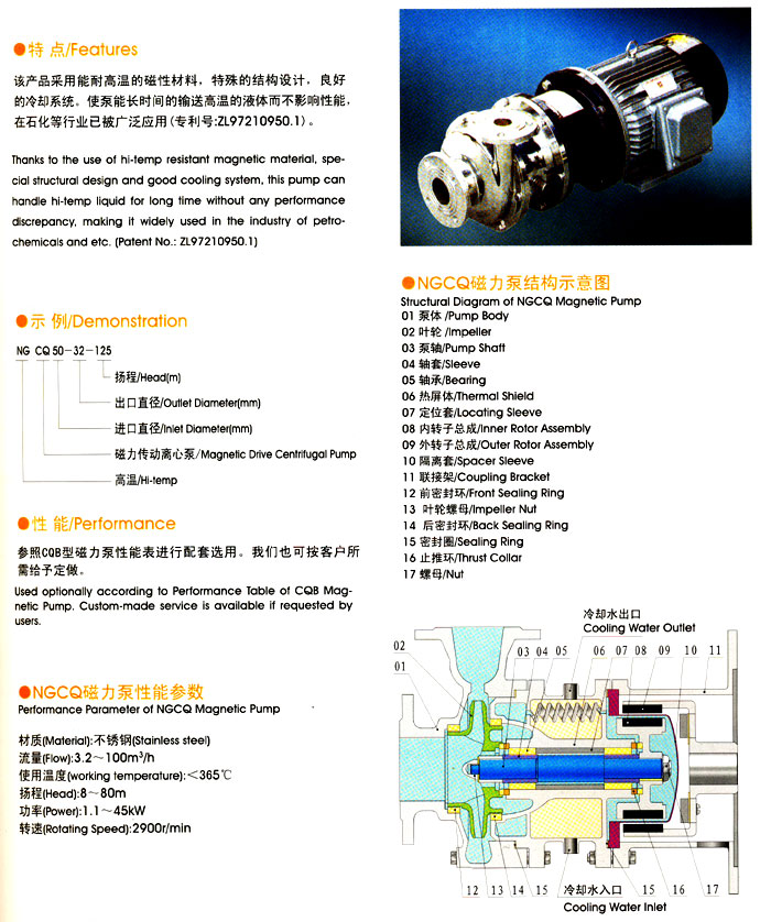 NGCQ型(耐高溫)≤450℃(水冷卻)磁力泵是采用內(nèi)外磁鋼推拉傳遞,磁路中間采用隔離套將液體封閉在隔離套內(nèi),以靜密封取代動密封,使泵的過流部件處于密封狀態(tài),解決了其它泵的機械密封無法避免的跑、冒、滴之弊病。磁力泵選用耐腐蝕、高強度的工程塑料、鋼玉陶瓷、不銹鋼作為制造材料,因此具有良好的抗腐蝕性能,并可使被輸送介質(zhì)免受染。